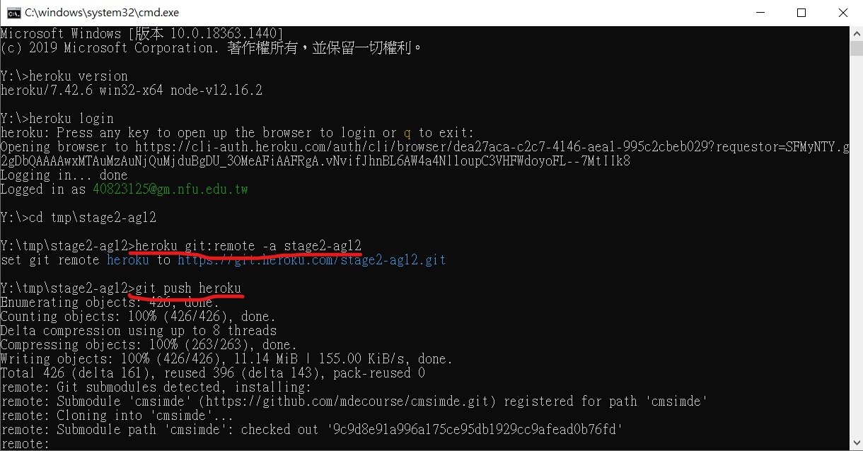 5.測試是否能夠在修改後的命令列中執行 heroku.exe, 輸入 heroku version 若回應所使用的版本表示上述路徑設定已經成功